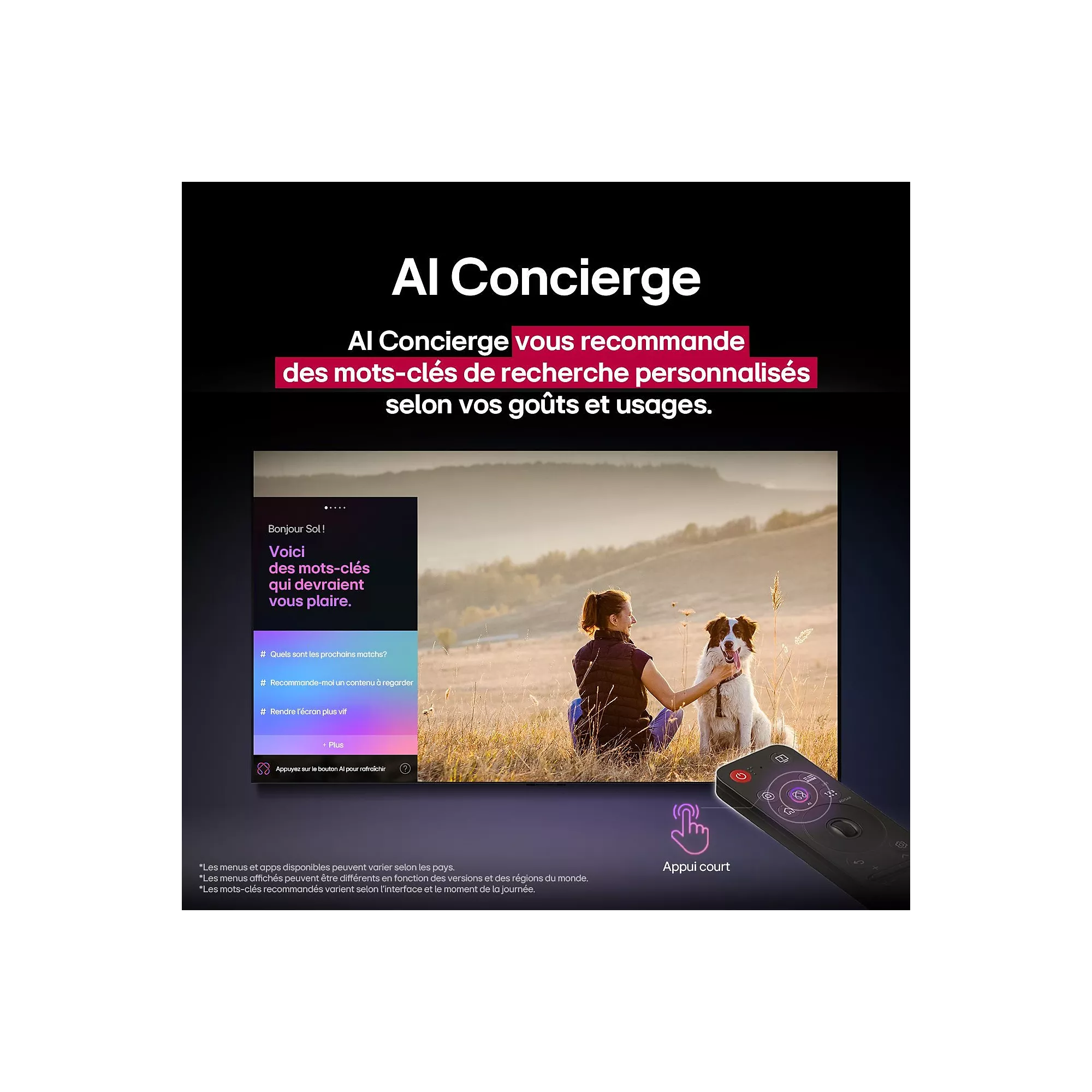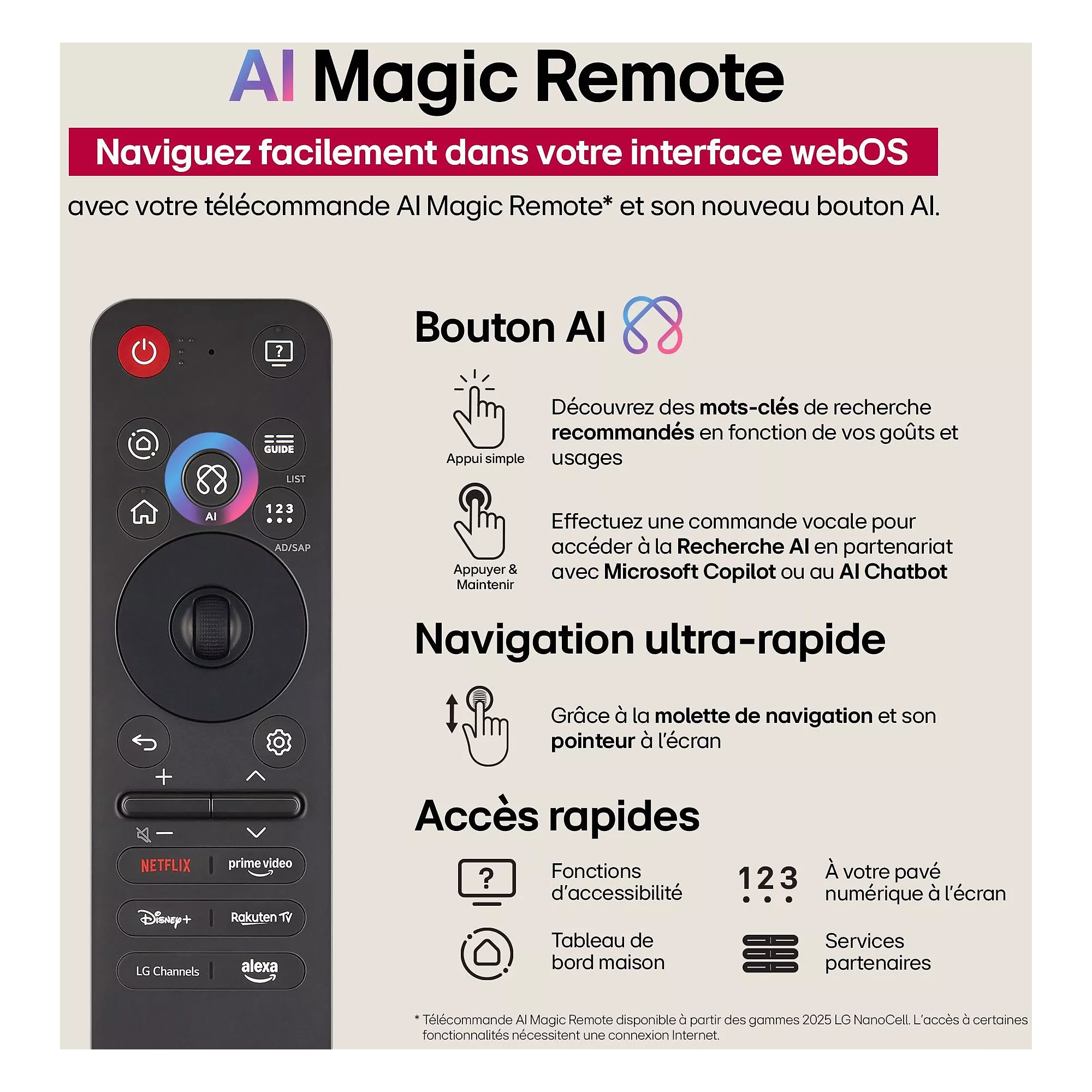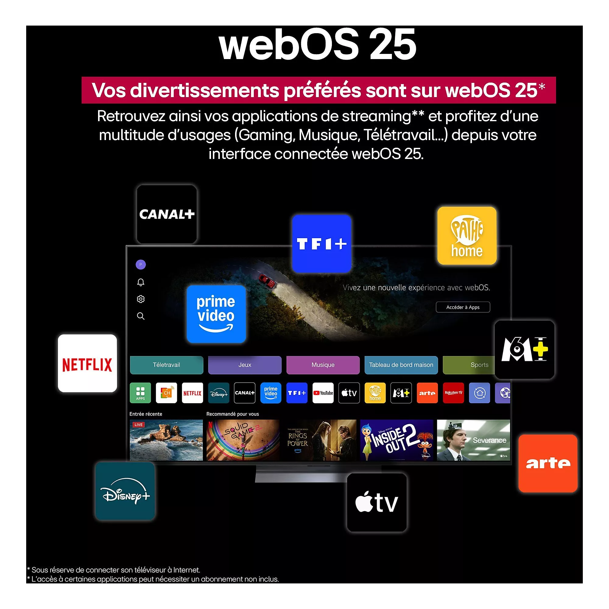 - Smart TV sous système WebOS (LG) : accès rapide à Netflix, Disney+, YouTube…